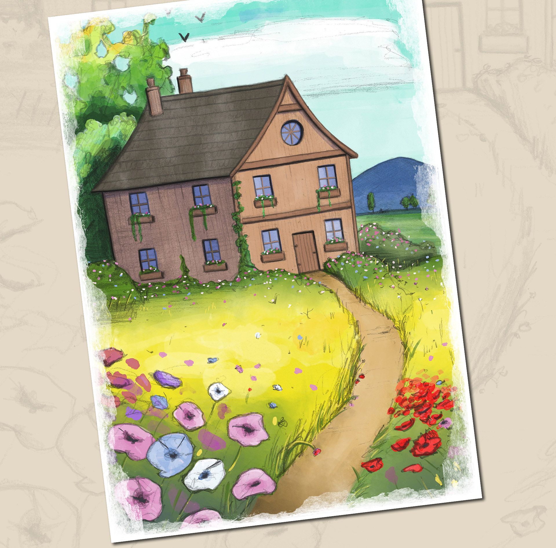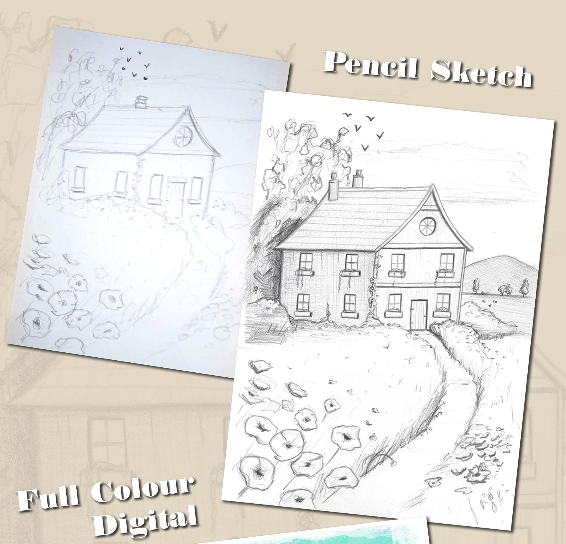 In this project, we were contracted to create a book cover of a cottage/hotel surrounded by lush flowers in an Irish country setting. We wanted to incorporate traditional pencil sketching with digital vibrant water colours.
